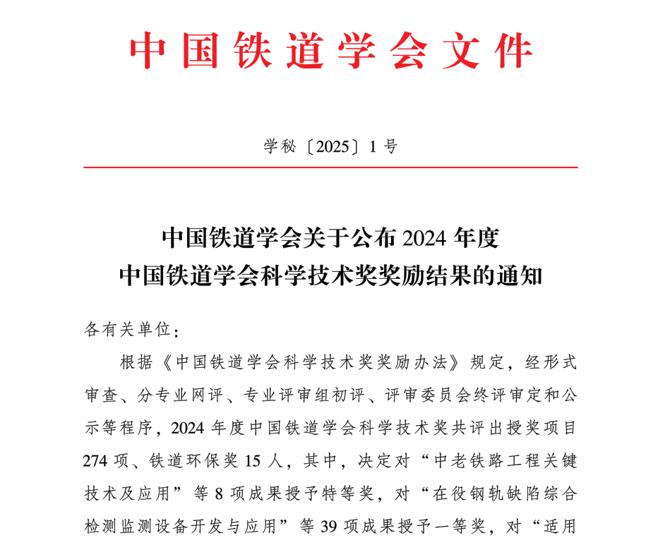 中國鐵道學會科學技術(shù)獎設(shè)立于2002年,旨在獎勵鐵道行業(yè)科技活動中做出突出貢獻的單位和個人,調(diào)動科技工作者的積極性,提高鐵路技術(shù)創(chuàng)新能力,加速鐵路現(xiàn)代化建設(shè)。中國鐵道學會科學技術(shù)獎作為鐵道行業(yè)最有影響、最具權(quán)威的科技獎項,見證了鐵道行業(yè)挑戰(zhàn)極限、勇創(chuàng)一流的科技輝煌,筑就了鐵路科技工作者勇攀高峰、敢為人先的精神豐碑。